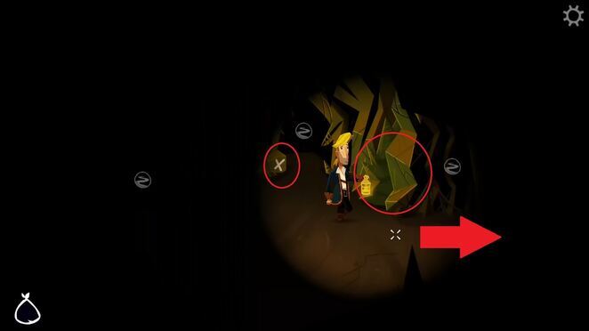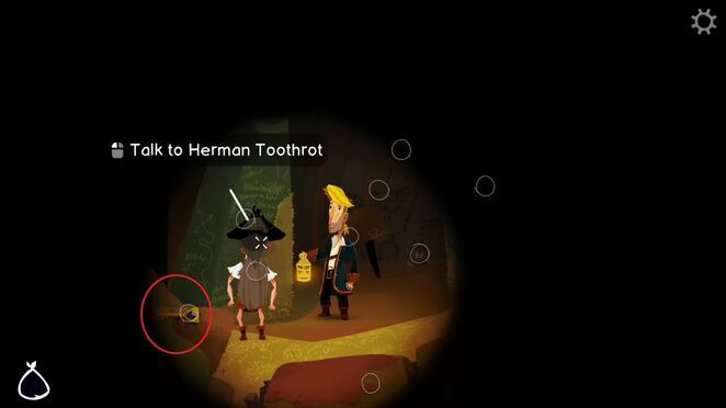 당신은 그것을 잡으려고 할 수 있지만 그는 바로 거기에서 당신을 막을 것입니다. 원하는 경우 모든 대화를 시도할 수 있지만 그는 키를 주지 않습니다. 당신은 그에게 열쇠를 달라고 말하고 다시 그것을 주장해야 합니다. 그것은 당신과 Herman 사이의 싸움을 촉발할 것이며, 결국 당신은 열쇠를 손에 쥐게 될 것이지만 램프는 부서지고 당신은 어둠 속에 있게 될 것입니다. 여기서 해야 할 일은 인벤토리에서 빛나는 표시를 읽는 것입니다. 그러면 동굴 밖으로 나갈 수 있습니다. 다른 키를 확보했습니다. 그 지역을 떠나면 컷신에서 해적 지도자들과 LeChuck의 선원들이 문제를 일으키기 시작하는 것을 보여줍니다.