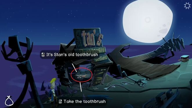 숲을 떠나 조선소로 향합니다. 거기에 Stan의 사무실이 보이고 창문을 통해 Stan이 필요로 하는 칫솔을 볼 수 있지만 주울 수는 없습니다. 그러나 사무실에서 바로 퀴즈 카드가 있으며 더 오른쪽으로 가면 " 이상한 덩어리 "가 있습니다. 바다 스폰지, 당신은 그것을 집어 들고 갈 수 있습니다.