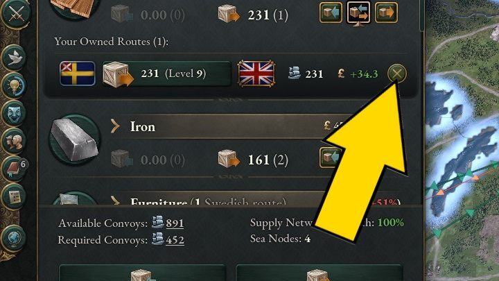 무역로를 폐쇄하려면 목록에서 관심 상품을 선택하고 루트 옆에 있는 십자 아이콘을 클릭합니다. 즉시 제거됩니다.