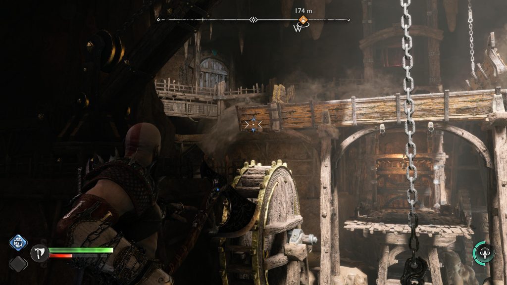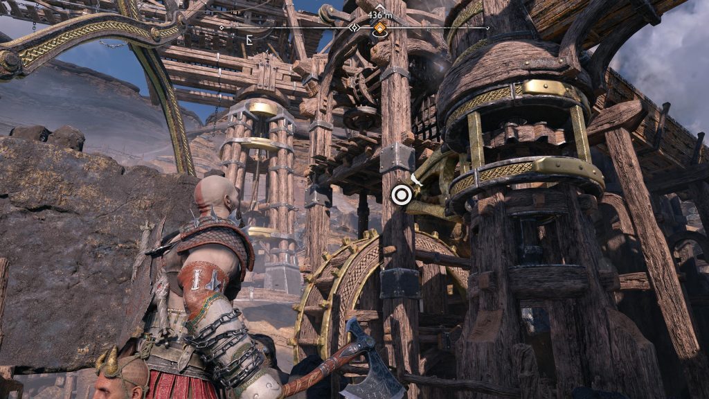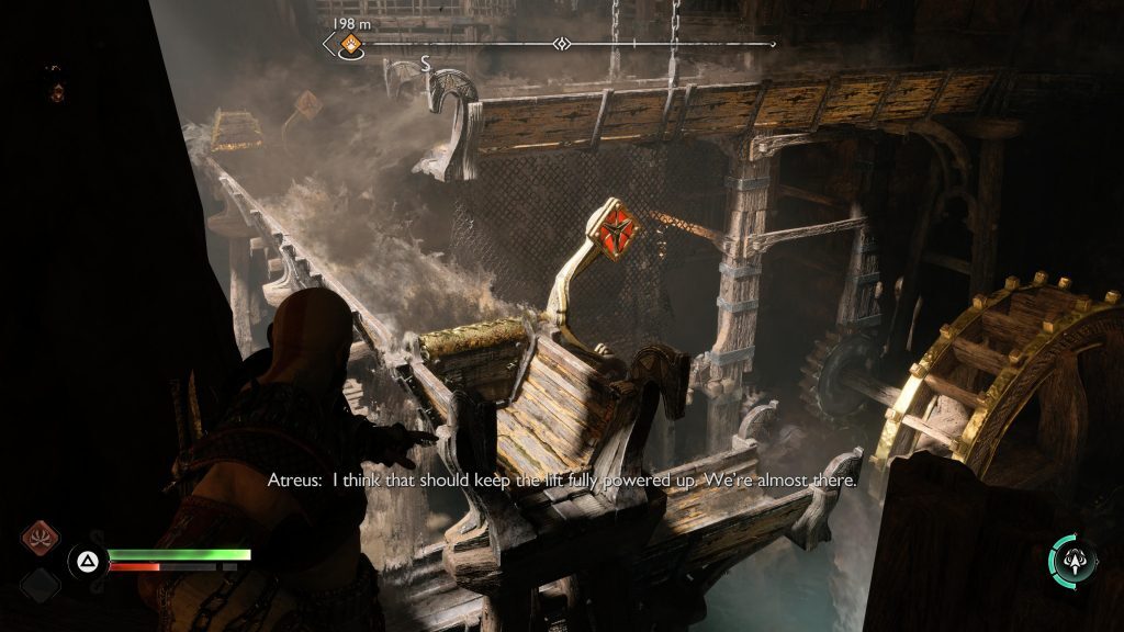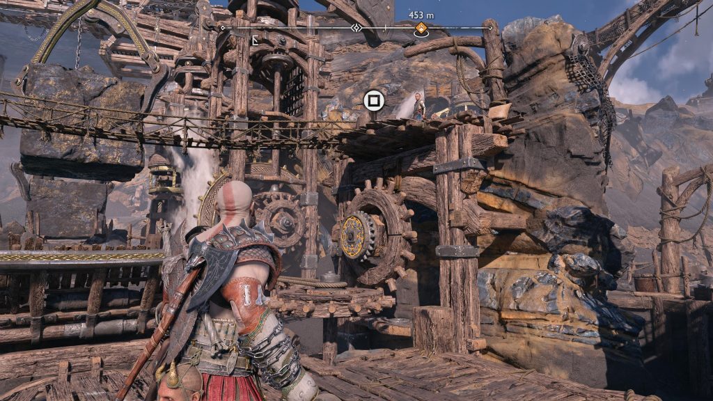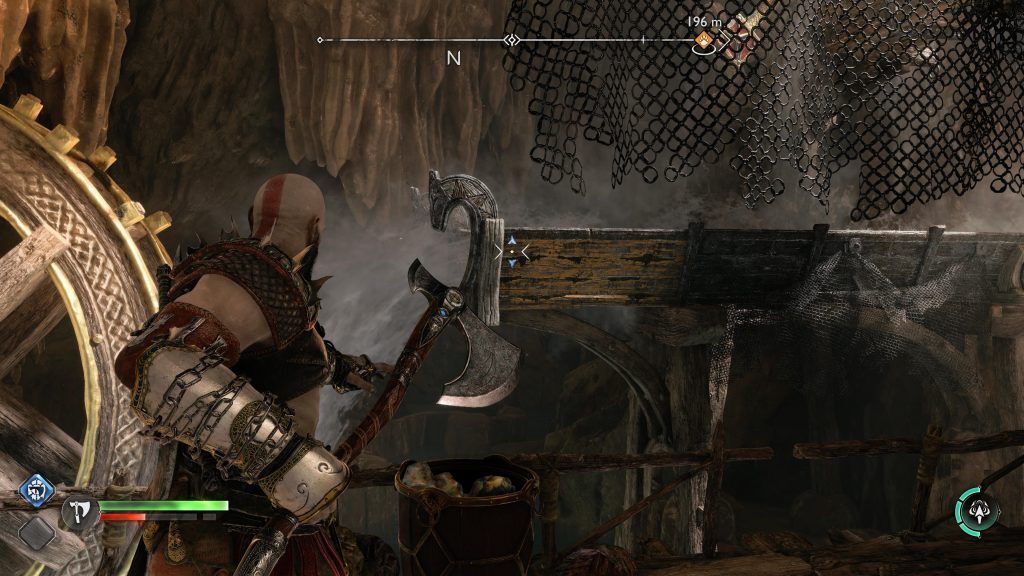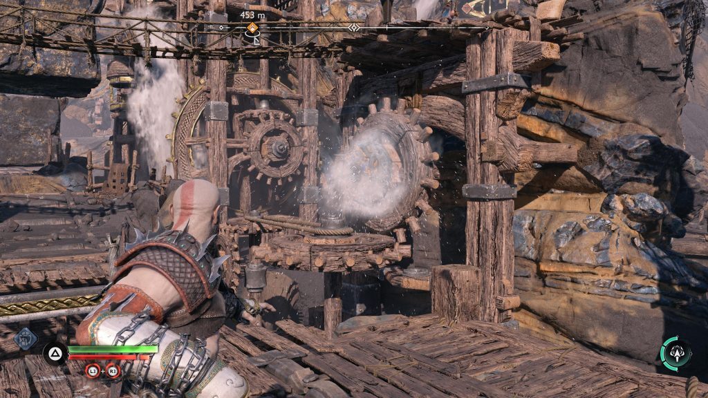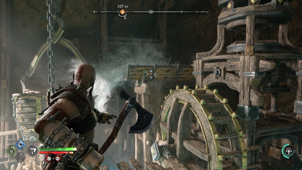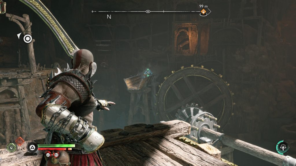 아트레우스는 틈을 뛰어 넘어 원형 레버 옆에 착지합니다. 네모 버튼을 눌러 그것을 당기도록 명령한 다음 그가 내리는 다리가 지면과 평평해지면 바로 아래에 있는 기어에 도끼를 던지십시오.