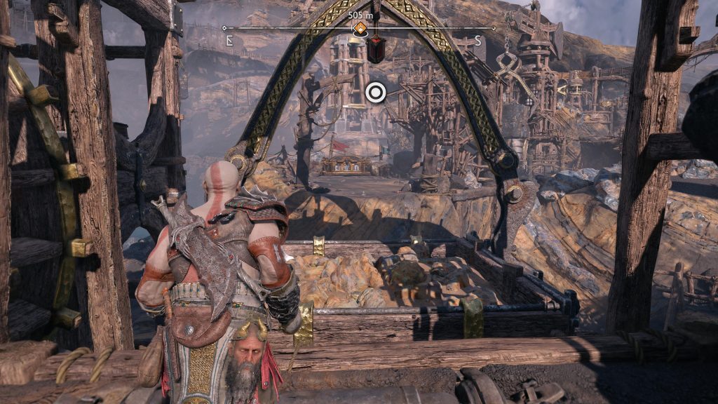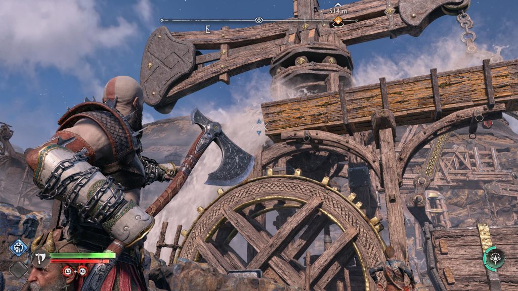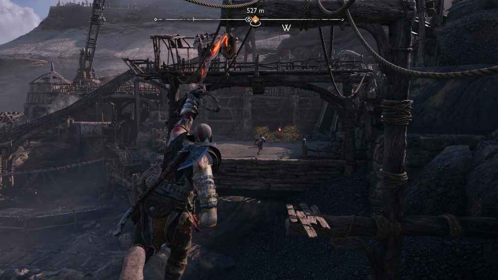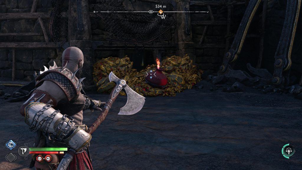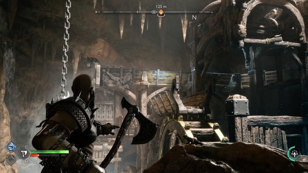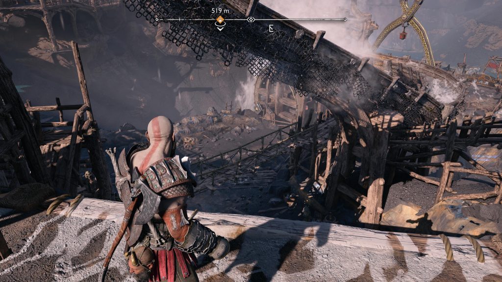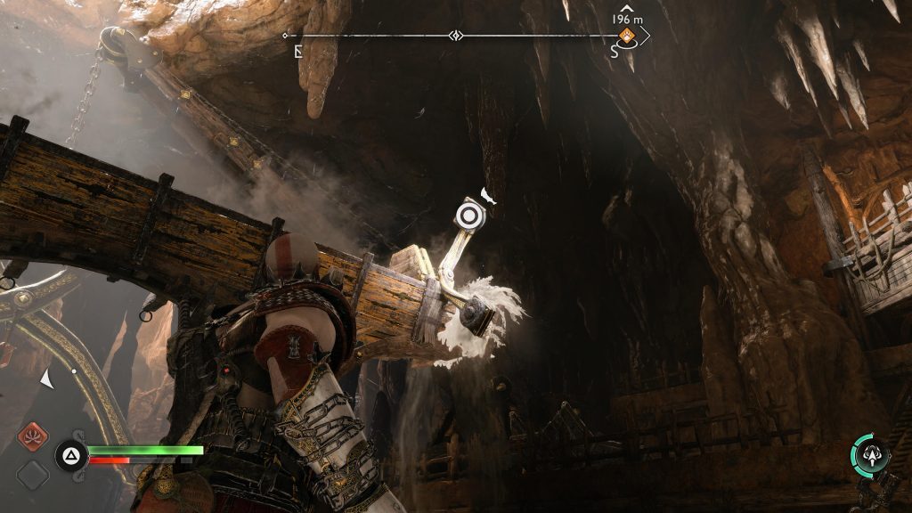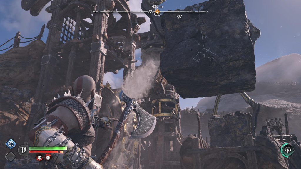 아트레우스는 틈을 뛰어 넘어 원형 레버 옆에 착지합니다. 네모 버튼을 눌러 그것을 당기도록 명령한 다음 그가 내리는 다리가 지면과 평평해지면 바로 아래에 있는 기어에 도끼를 던지십시오.