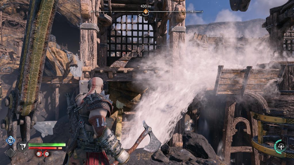 당신 앞에 있는 난간 위로 올라간 다음 돌아서서 바퀴를 돌리는 물에 도끼를 던지십시오. 이것은 큐브를 낮추고 당신이 그것에 도달할 수 있게 해줍니다. 정상에 오르면 도끼를 회수하면 Atreus의 수준까지 올라갈 수 있습니다. 틈새를 뛰어 넘어 Atreus와 당신을 분리하는 문을 들어 올리십시오.