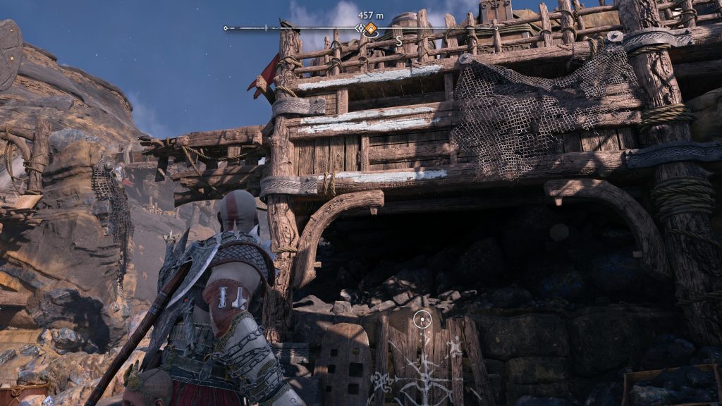 바퀴가 얼어붙은 상태에서 이전에 화물로 막힌 틈을 뛰어 넘고 오른쪽으로 건너뛰십시오. 흰색 페인트가 칠해진 나무 벽을 만날 때까지 주요 경로를 따르십시오. 그것과 상호 작용하면 등반을 위해 Atreus를 던질 것입니다.