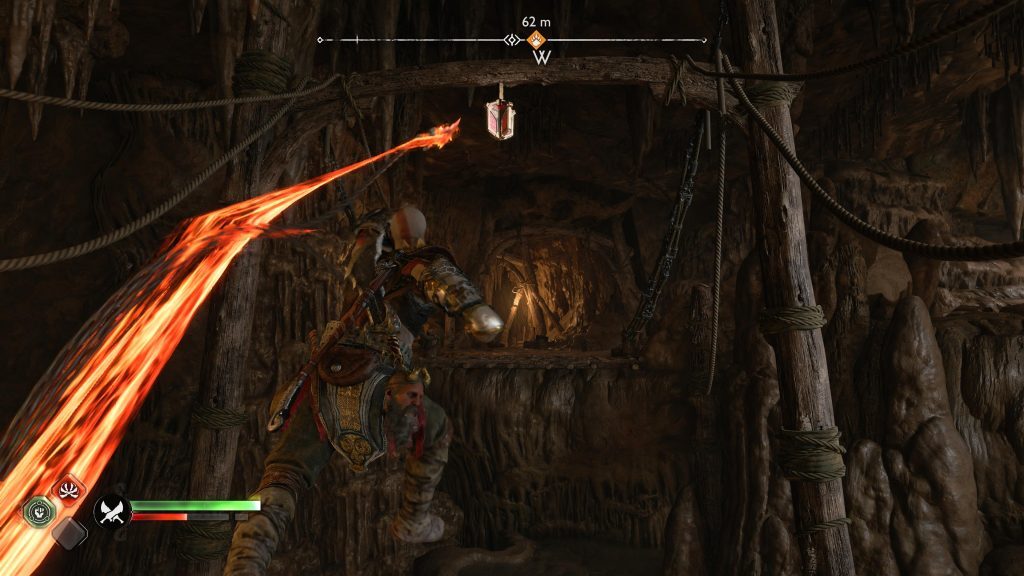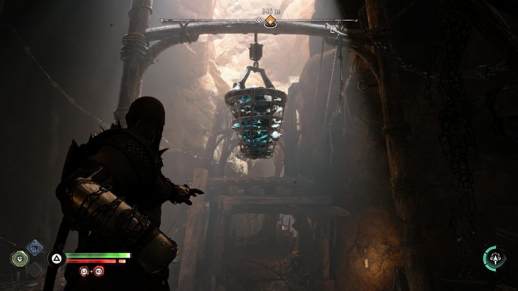 갈림길에서 오른쪽 길로 가다가 밧줄에 연결된 사슬을 잡습니다. 사슬을 당겨 밧줄을 올리기 전에 밧줄을 잡고 있는 녹색 광석을 조준하고 Atreus가 그것을 파괴하도록 하십시오. 그것이 사라지면 체인을 당기고 로프를 올린 다음 아래로 내립니다.