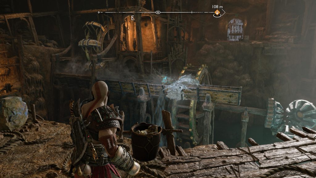 광산 반대편으로 나가면 Jarnsmida Pitmines라는 새로운 지역이 나옵니다. 왼쪽 난간으로 뛰어내려 거대한 나무 화물칸 왼쪽에 있는 회전하는 물레방아에 접근하세요. 물에 도끼를 던져 물을 얼리십시오.