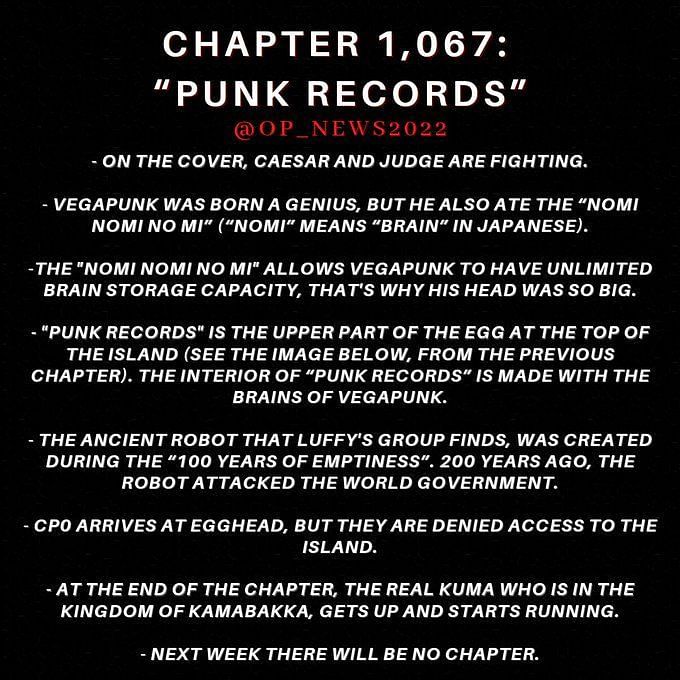 원피스 1067화의 초기 스포일러는 제목이 달걀 안에 있는 에그헤드의 윗부분을 가리킨다고 명시합니다. 이 문장 뒤에는 "그것은 Vegapunk의 두뇌로 구성되어 있습니다."가 뒤따르는데, 이는 그의 두뇌에서 지식을 추출하여 현실 세계에 저장하는 Brain-Brain Fruit의 능력을 언급할 수 있습니다.