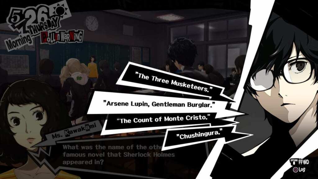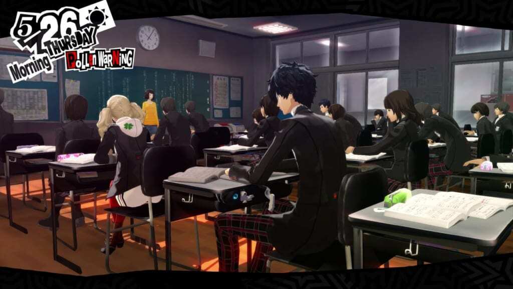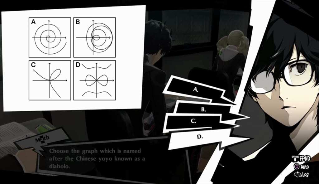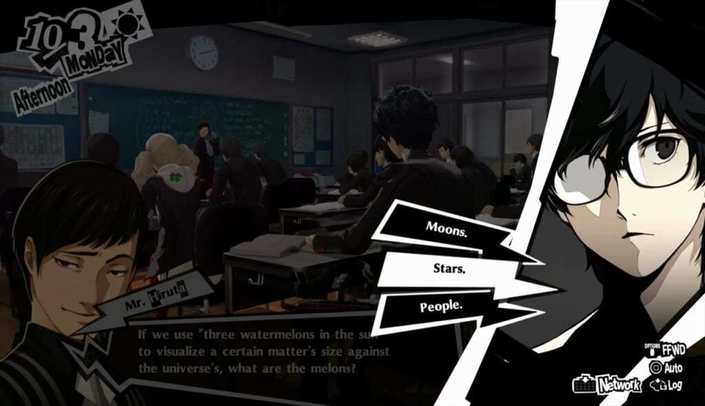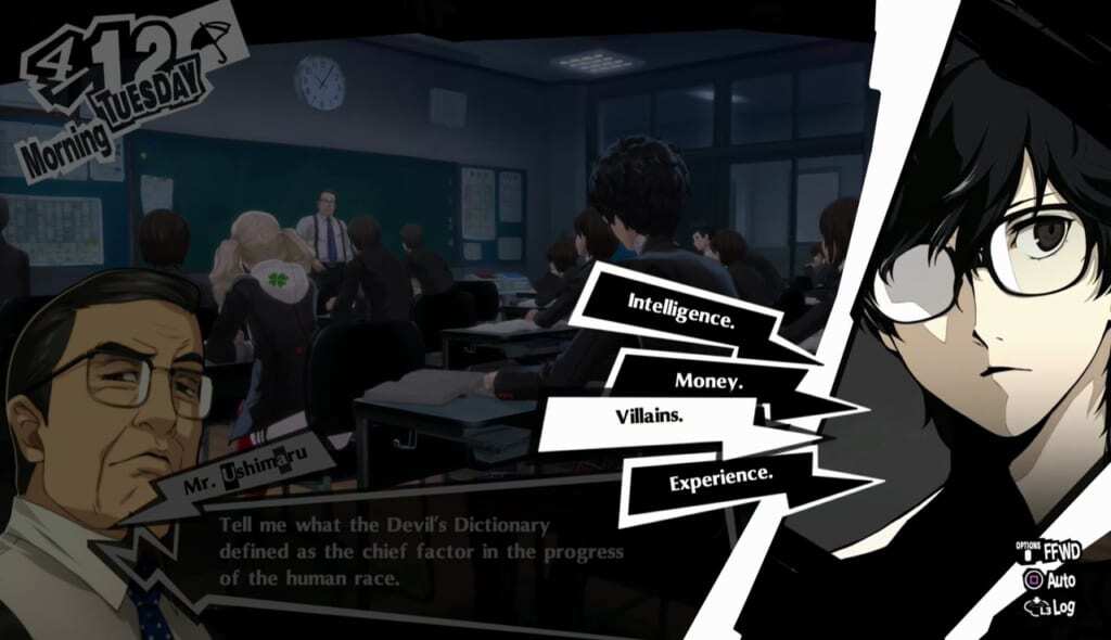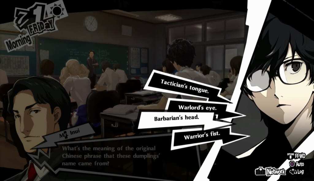 페르소나 5 로얄 의 슈진 아카데미 수업에 참석하는 동안 주인공은 때때로 선생님이 묻는 수업 질문에 답하기 위해 호출됩니다.