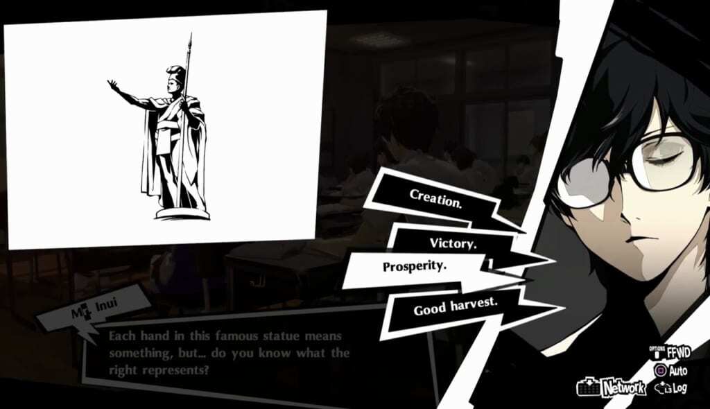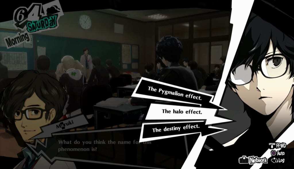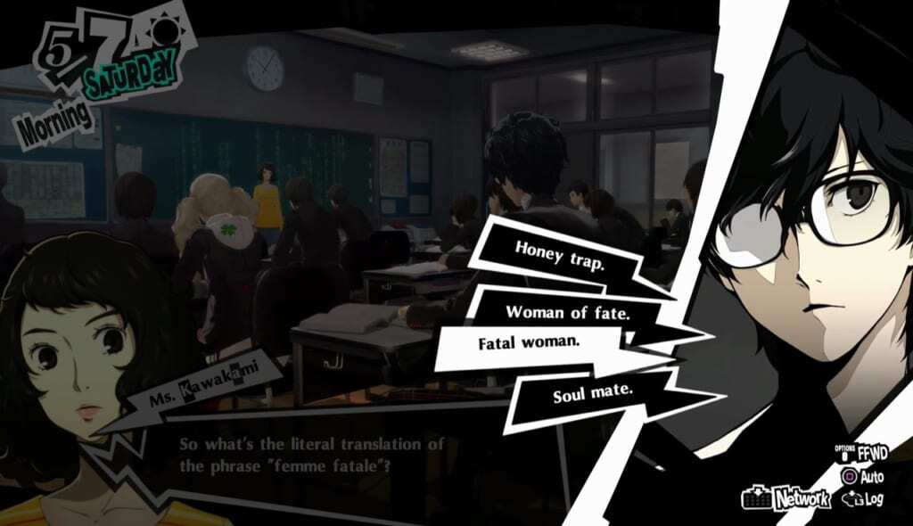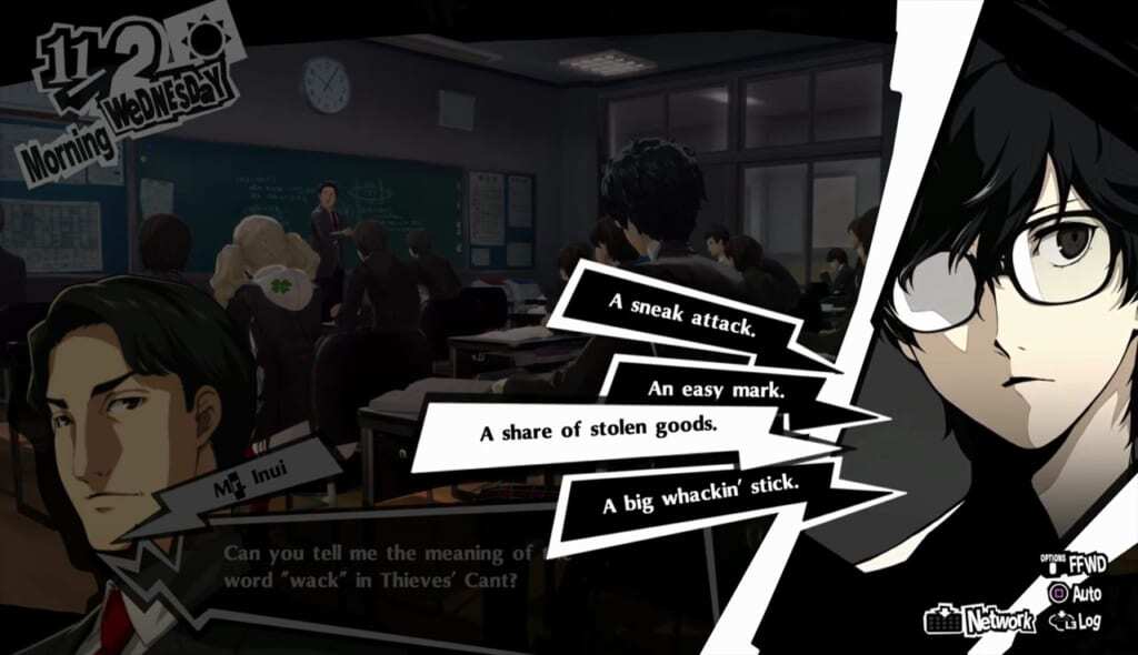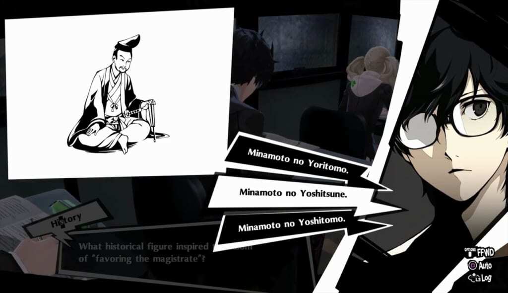 페르소나 5 로얄 의 슈진 아카데미 수업에 참석하는 동안 주인공은 때때로 선생님이 묻는 수업 질문에 답하기 위해 호출됩니다.