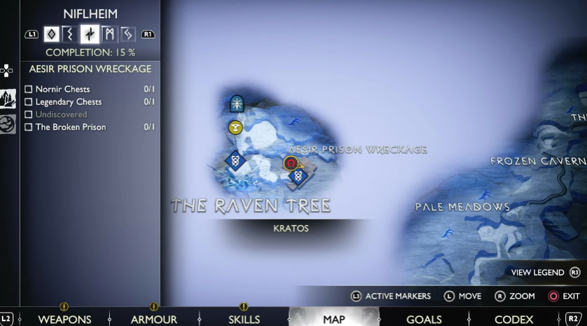 스토리가 완료되면 Raven Tree의 왼쪽으로 열리는 새로운 길에 접근할 수 있습니다. Raven Tree에서 이어지는 주요 경로를 따라야만 이 지역으로 이동할 수 있습니다. 이 길을 따라 Aesir Prison Wreckage로 가십시오. God of War Ragnarök, Aesir Prison Wreckage의 Nornir Chest 지도에 표시된 정확한 위치는 다음과 같습니다.