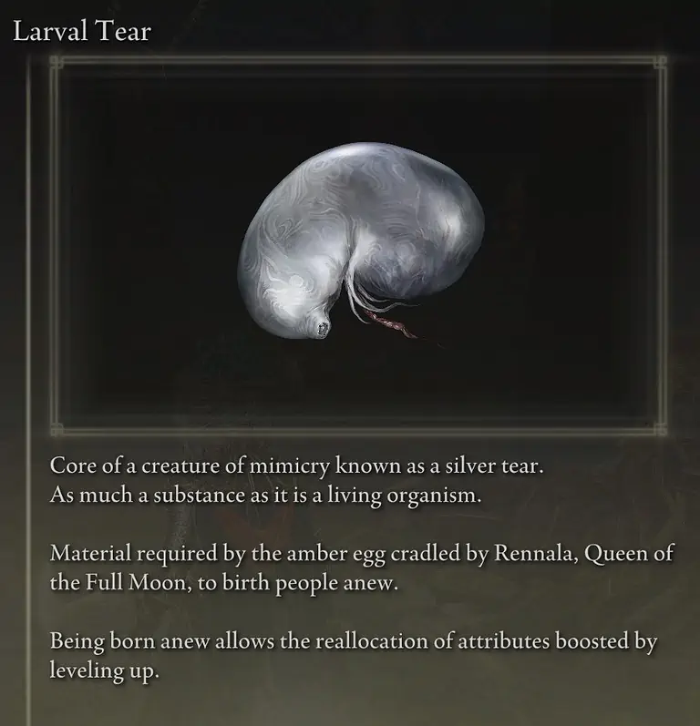재사양할 때마다 Rennala에게 Larval Tear를 제공해야 합니다 . 이 소모품은 사용 시 손실됩니다.
