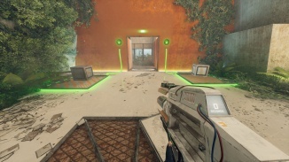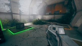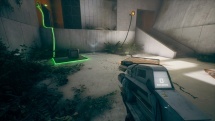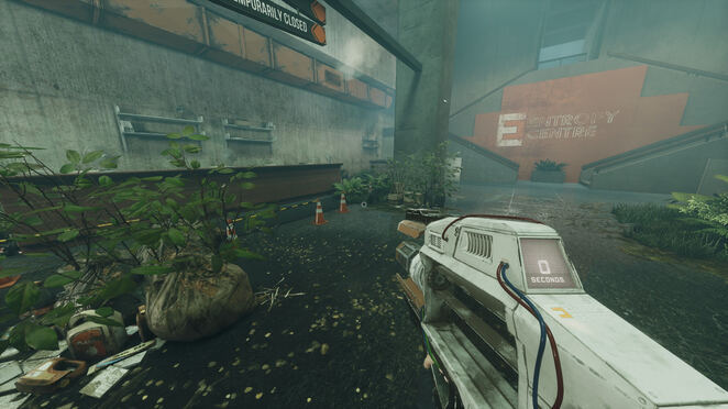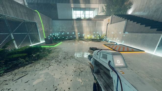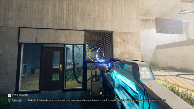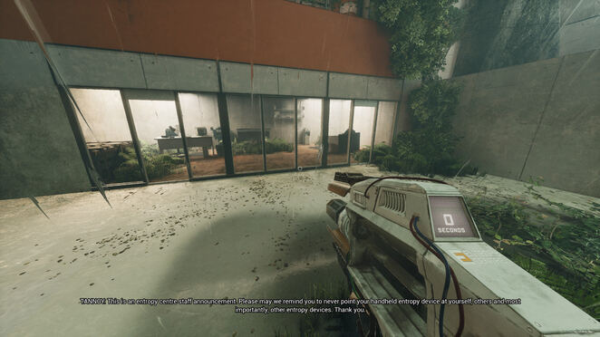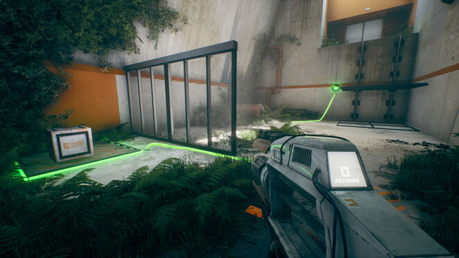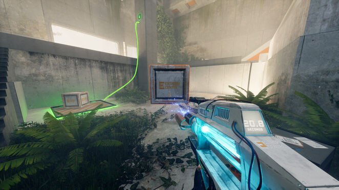 유리로 둘러싸인 방에서 휴대용 엔트로피 장치를 살펴보십시오. 잠금을 활성화하기 위해 누를 수 있는 버튼이 있습니다. 그것을 누르면 HED가 작동하는 것을 볼 수 있습니다! 기둥을 다시 조립합니다! 이것은 엔트로피 센터 전체에서 퍼즐을 풀기 위한 우리의 도구가 될 것입니다. 프레젠테이션이 끝나면 오른쪽 문을 통해 HED 옆 테이블의 빨간 버튼을 누르세요. 이제 제어할 수 있습니다. 게임에서 앞에 있는 기둥에서 테스트하라는 메시지를 표시합니다.