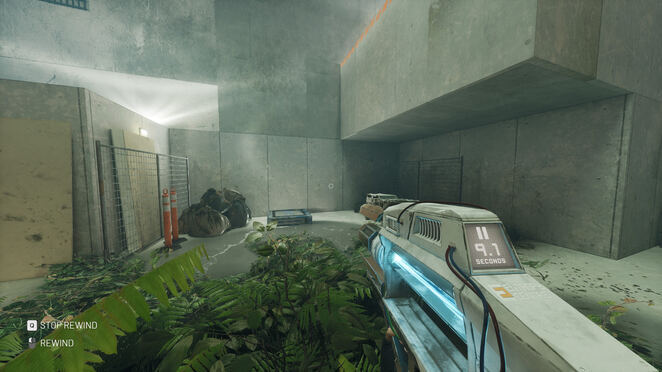 움직이는 셔틀을 탈 때까지 이 길을 따라가세요. 당신의 생존율이 얼마나 낮은지에 대해 AI가 말하는 것을 들을 동안 레일을 타십시오. 각 측면의 기둥에 주의하십시오. 그들은 당신에게 무너질 것입니다. HED를 사용하여 시간을 되감기 시작할 때마다 오렌지색으로 깜박이는 것을 볼 수 있어 위에서 무너지는 것을 방지할 수 있습니다. 곧 전기가 통하는 계단에 도달하게 됩니다. 차단기 상자를 되감아 전기를 차단합니다. 출구로 표시된 문 아래 부서진 플랫폼에 도달할 때까지 계속하십시오. 플랫폼에 서서 되감아 위로 올라갑니다. 이 작업을 완료하려면 엘리베이터에 도달할 때까지 앞의 경로를 따르십시오.