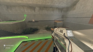 앞으로 이동하여 오른쪽을 보십시오. 이 방의 출구에서 파괴된 다리를 볼 수 있습니다. 위로 올리기 위해 되감기는 하지만 부분적으로만 진행되는 것을 볼 수 있습니다. 그게 우리가 필요한 모든 다리입니다! 점프 큐브를 들고 위의 이미지와 같이 더 짧은 플랫폼과 더 높은 플랫폼 사이를 이동하세요. 그것을 사용하여 더 짧은 플랫폼으로 점프하고 발판을 사용하여 더 높은 플랫폼에 도달하십시오. 점프 큐브를 되감아 원래 위치로 되돌립니다. 이제 이 더 높은 플랫폼의 발판을 사용하여 방을 가로질러 자신을 발사하십시오. 점프 큐브에 착지하고 이 퍼즐을 종료하기 위해 올린 다리로 건너갑니다.
