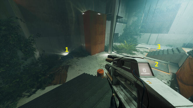 이 방에는 두 개의 스위치가 있는 두 개의 큐브가 있습니다. 먼저 왼쪽 스위치에 큐브를 놓아 타임 게이트를 비활성화합니다. 다른 큐브를 잡고 계단 위로 옮깁니다. 엘리베이터에 도달할 때까지 이 경로를 따르십시오. 큐브를 엘리베이터에 놓고 두 스위치로 다시 내려갑니다.