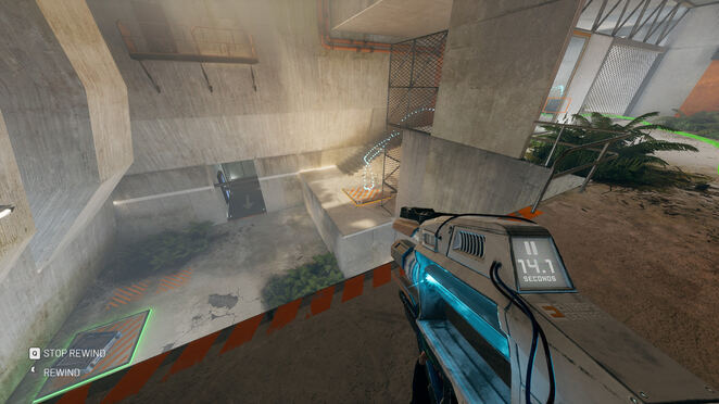 이 방의 오른쪽에 큐브가 있습니다. 여기에 두 개의 스위치가 있습니다. 큐브를 먼저 왼쪽 스위치에 놓고 출구를 엽니다. 그런 다음 오른쪽 스위치로 이동하여 계단 상단의 문을 엽니다. 계단을 뛰어 올라가 위의 플랫폼에서 큐브를 내려다보세요. 큐브를 되감아 첫 번째 스위치로 다시 이동하여 문을 열고 이 퍼즐을 종료하세요.