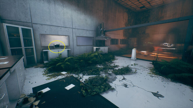 들어가면서 이 방의 저편을 보십시오. 부서진 비계 위에 사무실이 있습니다. 그 위에 서서 HED를 사용하여 되감기하여 이 사무실까지 올라오세요. 여기 왼쪽에 있는 컴퓨터에는 읽을 수 있는 터미널 메시지가 있습니다.