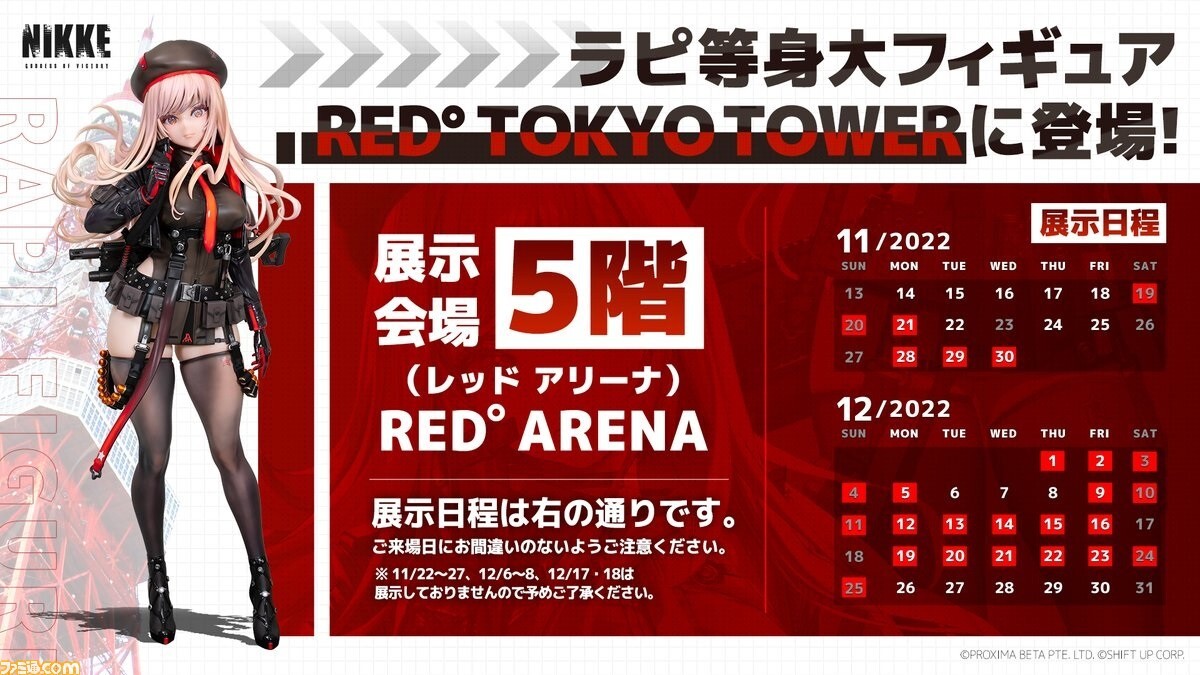 11월 19일(토)부터 12월 25일(일)까지, 정식 릴리스시에 특별 작성한 본작의 인기 캐릭터 「라피」의 등신대 피규어는 기간 한정으로 RED°TOKYOTOWER 5층 RED°ARENA에서 전시중 입니다. 그리고 개최 기간 중에는 오리지널 상품 선물을 받을 수 있는 방문자 한정 캠페인도 실시하고 있습니다. 방문하신 분에게 스티커를 비롯해 다양한 NIKKE 오리지널 상품을 선물합니다!