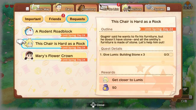마지막으로 요청 아래 에는요청이 있습니다.요청 은요청탭에서 선택할 수 있으며특정캐릭터가 제공하는 제작 또는 가져오기 퀘스트를 포함 합니다.그들 모두는 다른할 일과는 달리기한이있지만 다른할 일과는 달리금과우정 포인트의 형태로보상이 있습니다.