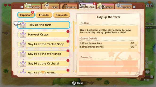 중요한할 일의 첫 배치를 완료하고 하루를 보냈습니다.이제 몇 가지 Friend To-Do가있다는 것을 알게 될 것입니다.그래서 해야 하지만 항상농장에서 계속 일해야 한다는 것을 기억하세요 . 이전에 우리가 심은 것을 돌보고 청소를 진행하고 기분이 좋으면 농장으로 가도록 권장합니다.잡화점에 가서 심을수 있는 새로운씨앗 을 받으세요.