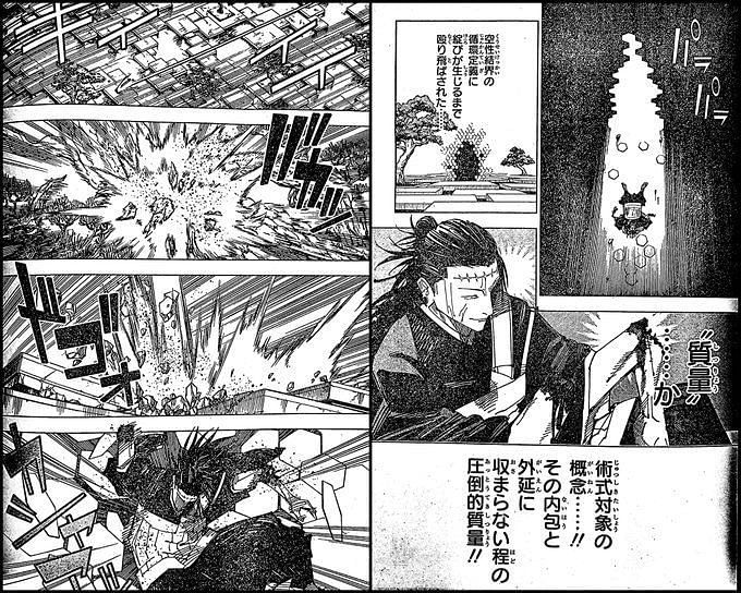 Yuki의 공격으로 인한 피해는 Kenjaku에게 충격을 주지만 그가 반응하기 전에 Yuki는 그를 날려 보낼만큼 세게 때립니다. 원시 스캔은 Kenjaku의 두 손이 펀치로부터 자신을 보호하려고 할 때 나뭇가지처럼 부러졌지만 여전히 충격으로 인해 신사의 지붕에서 폭발했음을 보여줍니다. 그러나 그는 다시 자신을 치유하며 역 저주 기술 을 사용할 수 있음을 드러냅니다 .