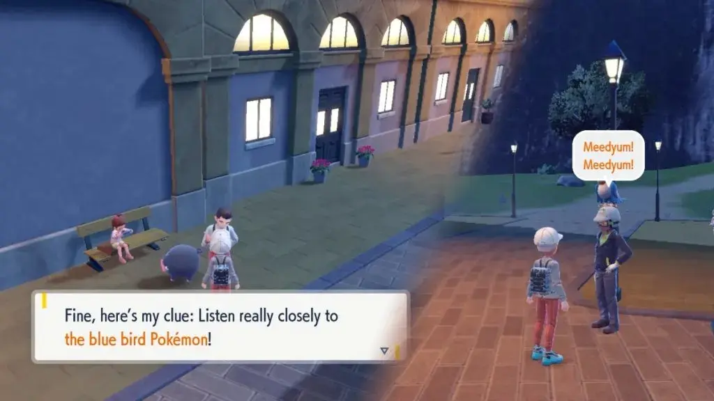 Treasure Eatery에서 나오면 앞 거리에 파란색 새를 머리에 얹은 남자가 서 있는 것을 볼 수 있습니다. 그의 포켓몬 Squawkabilly는 말풍선을 사용하여 여러 번 말을 걸고 결국 ' Meedyum '(AKA Medium)이라는 단어를 말합니다.