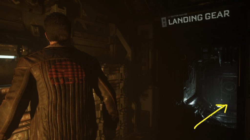 상자를 뛰어 넘은 다음 계속 앞으로 나아가 바로 앞의 문을 통과하십시오. 앞으로 걸어가면 제이콥이 화물을 확인하는 동안 잠시 통제력을 잃을 것입니다. 우회전하여 "Landing Gear"라고 표시된 계단을 내려갑니다.