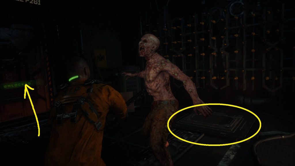 콘솔을 활성화한 후 방의 다른 쪽으로 가십시오. 나가야 하는 문은 왼쪽에 있지만 (3)을 통과하기 전에 근처 바닥 패널에서 적이 튀어나올 것입니다.