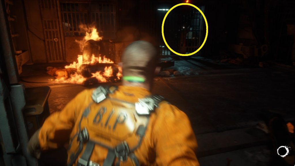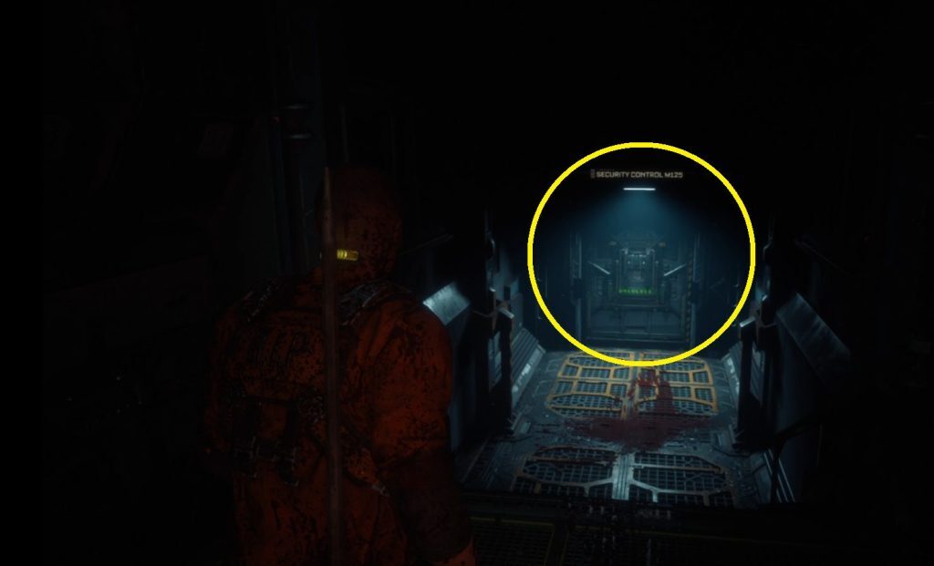 수술실로 계속 이동하여 작은 계단으로 가십시오. 어둠 속에서 잘 보이지 않을 수 있지만 구석에 안내하는 빛이 있습니다(1). 계단을 올라가 Mezzanine M123이라고 표시된 문까지 계속 전진한 후 퓨즈를 삽입하여 문을 엽니다. 통과한 다음 그 너머 복도에서 불길에서 나오는 적과 싸우십시오. 계속해서 문을 통과해 계단을 내려가 Security Control M125(2)라고 표시된 문을 통과합니다.