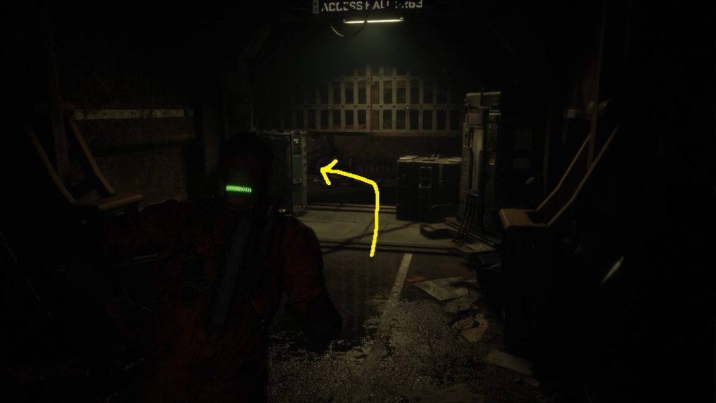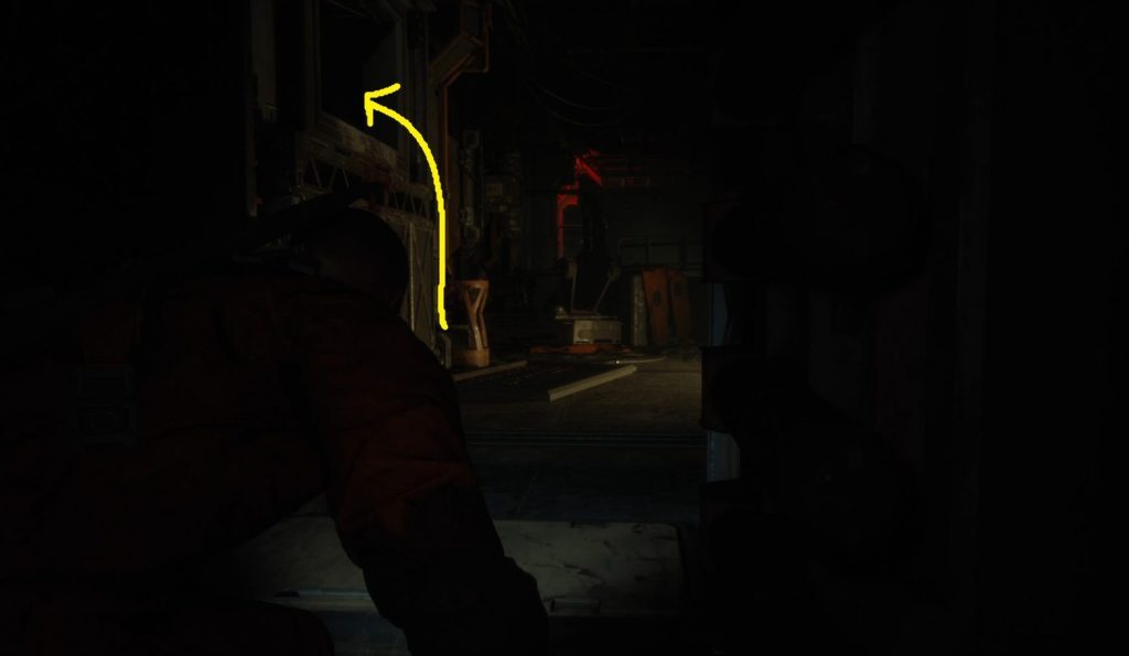 종료되면 반쯤 열린 문을 통해 앞으로 이동한 다음 왼쪽 통풍구로 올라갑니다(1). 로봇이 방을 떠날 때까지 통풍구에서 기다린 다음 통풍구 밖으로 계속 웅크리고 방을 나갑니다 — 계속해서 복도를 가로질러 출입구를 통과한 후 우회전합니다(2).