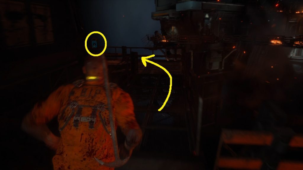 ! 타는 잔해 더미가 나올 때까지 계속 가십시오. 여기에서 왼쪽 아래로 계단을 이용하십시오(2).