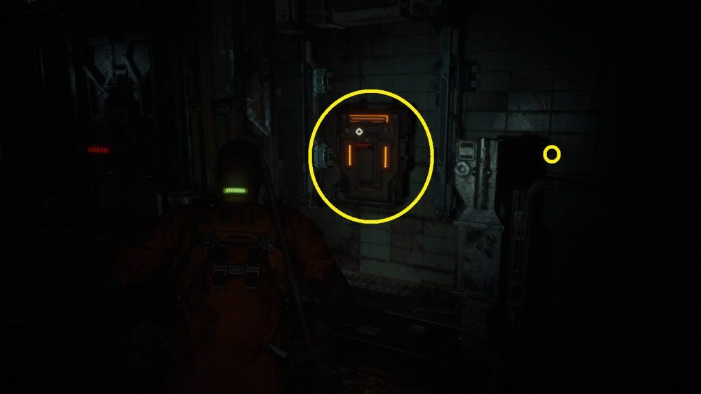 앞으로 가는 길은 이 방에 있지만 추가 자원을 수집하려면 약간 뒤로 물러나야 합니다. 오디오 로그가 있던 곳 옆에 있는 문을 통해 이 방을 나간 다음 오른쪽으로 돌아 복도로 내려갈 수 있습니다. 왼쪽에는 Cardiology M116 (1)이라고 표시된 문이 있습니다. 안으로 들어가 사물함을 약탈한 다음 오른쪽 문으로 들어갑니다. 왼쪽 계단으로 올라가 벽에 있는 소켓에 잡은 퓨즈를 꽂습니다(2). 이렇게 하면 퓨즈 박스 옆의 문이 열리며 내부에는 에너지 변환기와