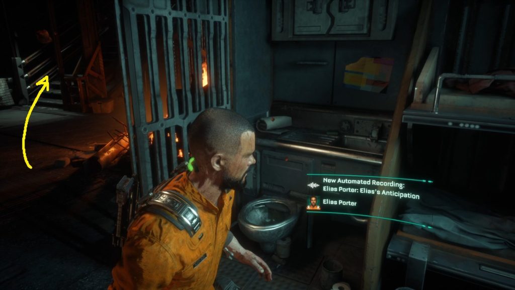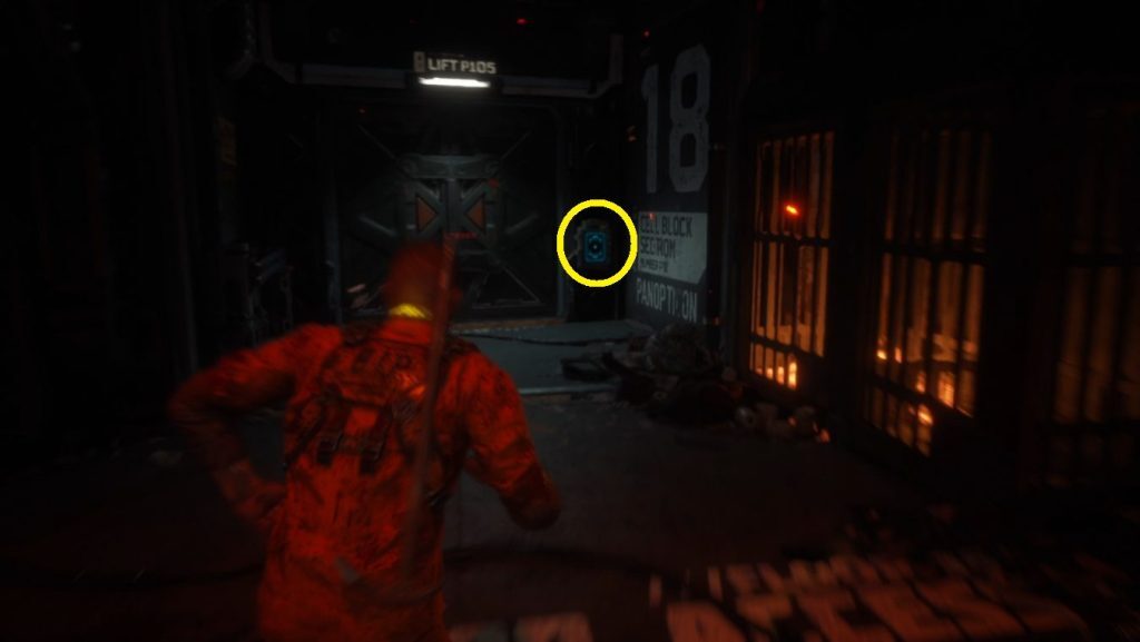 다음으로 근처 제어판으로 이동하여 상호 작용하여 Elias의 감방을 엽니다(1). 그런 다음 돌아서 들어왔던 문을 통과하고 모퉁이를 돌고 다시 다리를 건너십시오. 컷씬이 시작됩니다. 컷씬이 끝나면 Cellblock 24 P240이라고 표시된 출입구를 통해 직진하여 셀 블록 아래로 계속 내려갑니다.