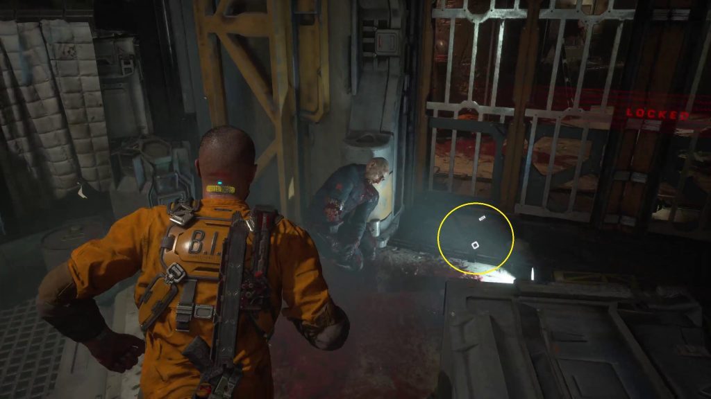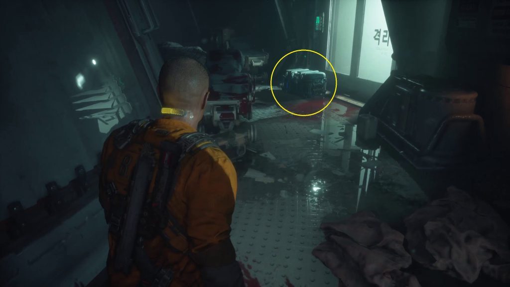 두 번째 바이오파지가 있던 오른쪽 방에는 여러 개의 유리 상자가 있습니다. 여기에는 때때로 전리품이 포함되어 있으며, 그럴 경우 근접 공격으로 부수십시오. 그런 다음 Laundry B202의 조명이 켜져 잠긴 문으로 접근하십시오.