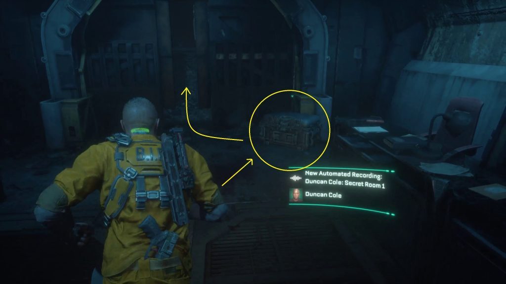 왼쪽에 있던 문을 계속 내려가기 위해 왔던 길로 되돌아갑니다. 지금은 왼쪽 문을 무시하고 앞으로 계속 진행하고 작업장 B415에 들어가기 위해 코드를 자르십시오. 통풍구 를 통해 오른쪽으로 가십시오 . 환풍구를 통과한 다음 이어지는 길을 따라 가다듬을 수 있는 틈을 만날 때까지 계속합니다(지금은 왼쪽에 있는 사다리는 무시하세요). 반대편에는 Duncan Cole의 오디오 로그인 "Secret Room 1"이 있는 신비한 방이 있습니다. 방 밖으로 나가면서 쥐어짜낼 수 있는 틈 옆에 있는 상자를 집으십시오.
