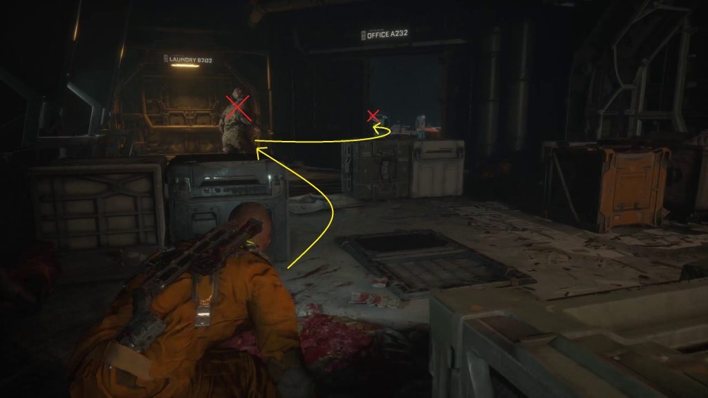 이 문을 통과하면 앞으로 계속해서 오른쪽으로 가십시오. 당신 앞에는 당신이 몰래 다가갈 수 있는 적이 있을 것입니다. 웅크려