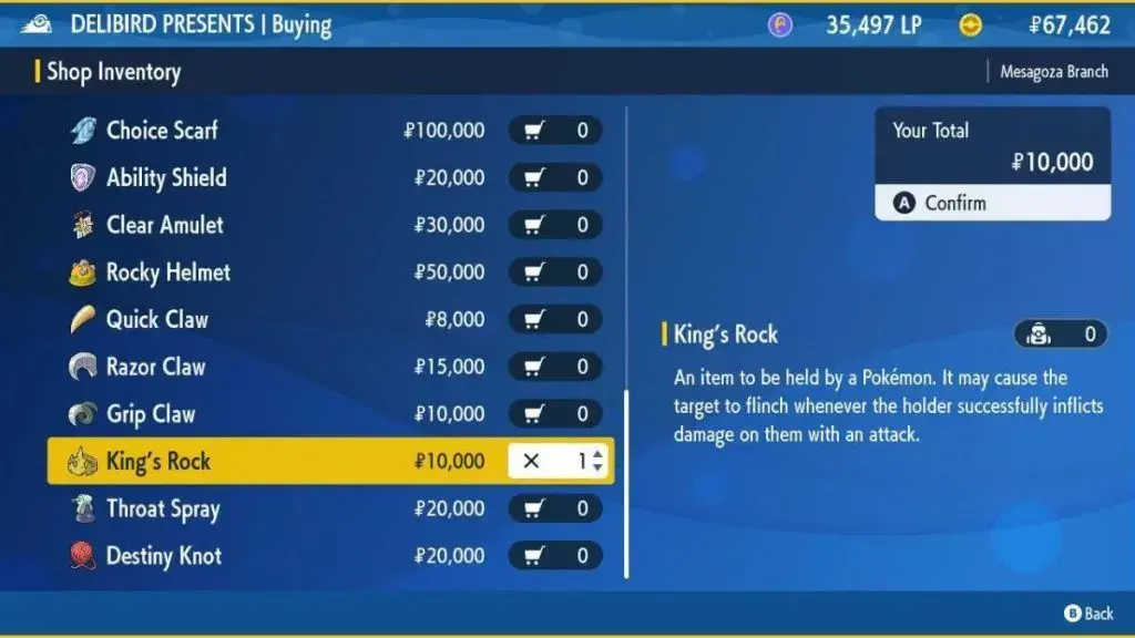 King's Rock을 얻으려면 트레이너가 Mesagoza에 있는 Delibird Presents 매장 중 한 곳에서 아이템을 구입해야 합니다. 왕의 바위는 ₽10,000이며 플레이어가 승리의 길 스토리 경로에서 체육관 배지 4개를 획득한 후에만 상점에서 찾을 수 있습니다.