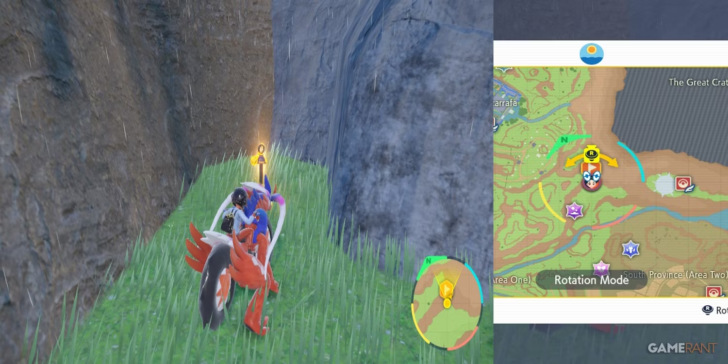 첫 번째 노란색 말뚝은 Alfornada Town 근처 에 있는 Leaked Tower of Paldea 근처의 산 꼭대기에서 찾을 수 있습니다 . 그것은 긴 흔적을 내려다보고있을 것입니다.