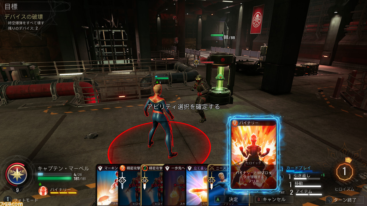 예를 들어 캡틴 마블은 자신의 카드를 3장 사용한 시점에서 "바이너리" 능력을 발동 가능. 대량의 추가 체력 "블록"을 획득하여 공격력이 극적으로 증가한다. 방패 역과 데미지 딜러, 어느 쪽에서도 최강 클래스인 것은 바로 해석 일치.