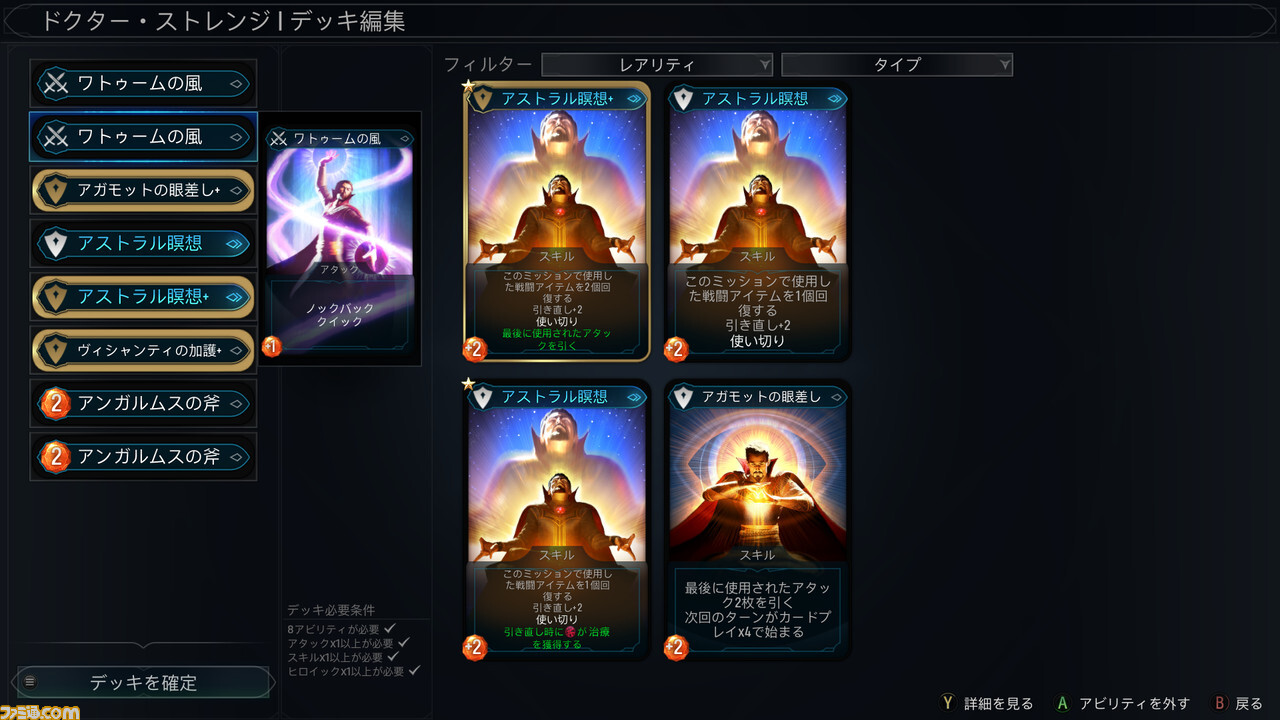 이 전투에 더욱 깊이를 주는 것이 각 히어로마다 어떤 어빌리티를 전투에 반입할 것인지를 미리 결정해 두는 '덱 편성'이다.