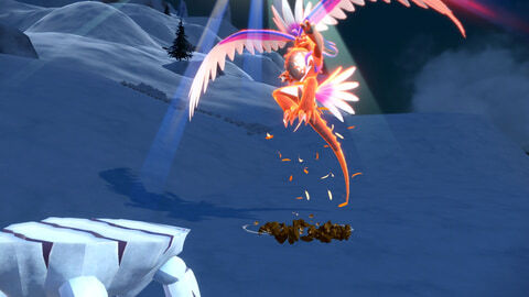 컴플리트 모드에서는 지상에 있는 상대에게 항상 유리한 위치로 부유하여 견제한다. 손톱이나 송곳니의 공격은 전기를 띠고, 또한 꼬리를 두드릴 때는 내부 기관에서 발생시킨 에너지를 사용하여 아무리 튼튼한 몸을 가진 상대라도 일격으로 기절시키는 힘을 발휘한다.