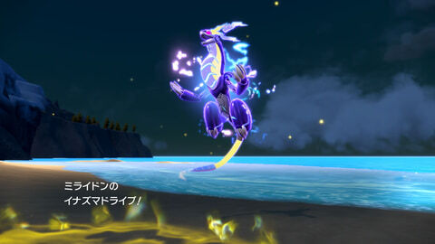 「이나즈마 드라이브」는, 덴키 타입의 특수기술. 미라이돈이 회전하면서 번개처럼 지그재그와 고속으로 달려가 대전격이 상대를 직격한다. 약점을 붙이면 위력은 더욱 올라간다.