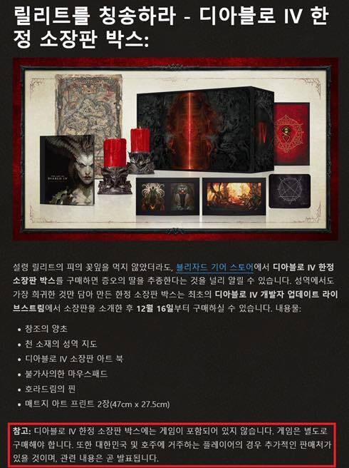 이 Collector's Edition 상자에는 실제로 게임이 포함되어 있지 않습니다. 대신, 위의 세 가지 버전에서 게임의 다른 복사본을 가져오면서 엑스트라를 원하면 구매하는 것을 의미합니다. Blizzard Gear Store를 통해서만 독점적으로 사용할 수 있으며 거의 확실히 수량이 매우 제한적일 것입니다. 선주문은 2022년 12월 15일에 시작됩니다.