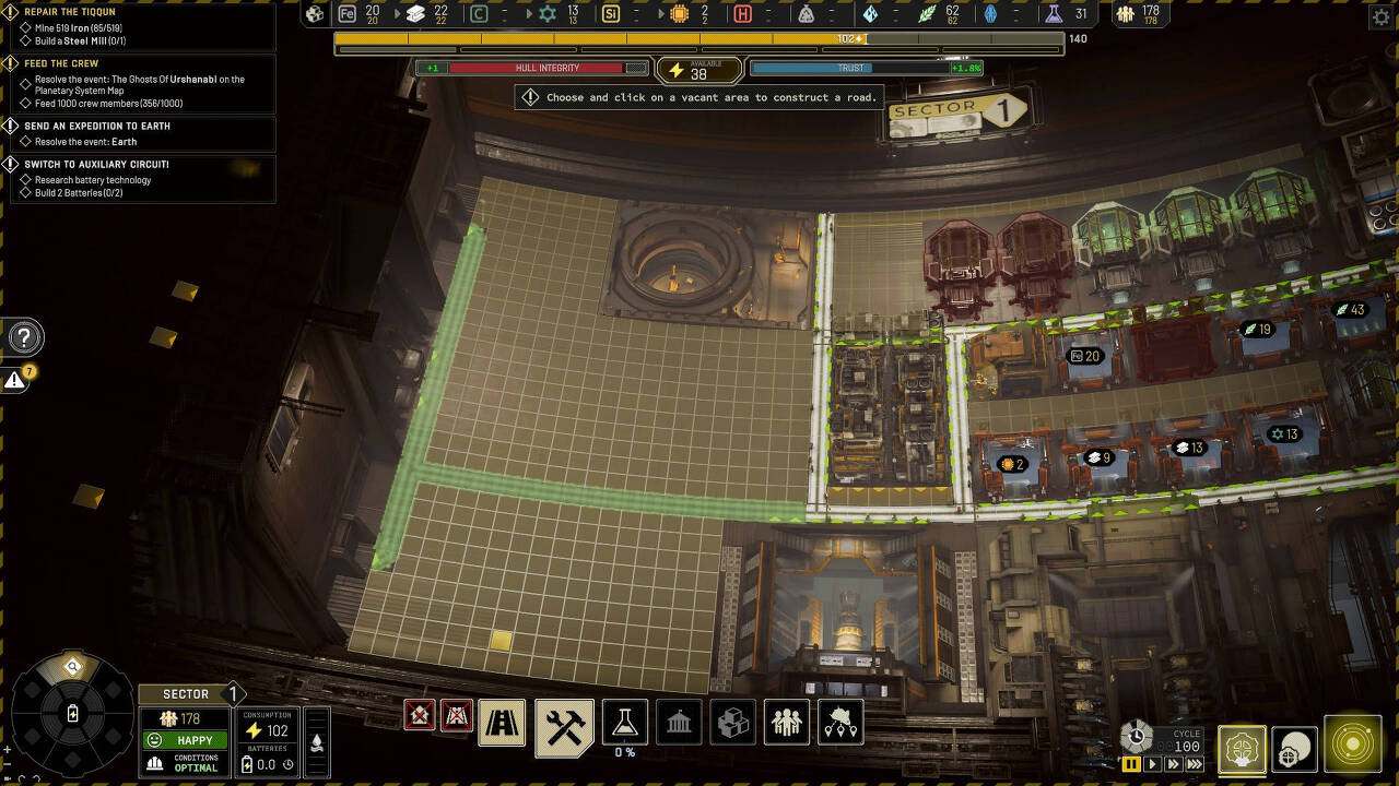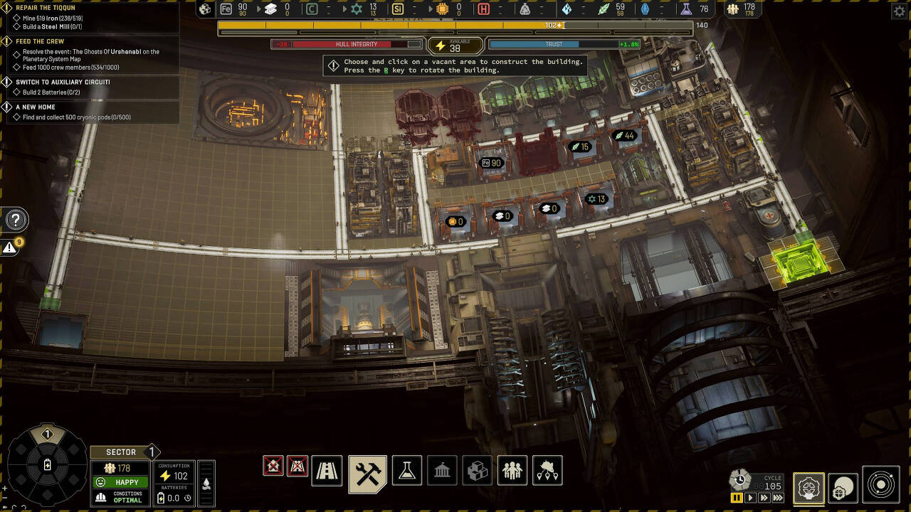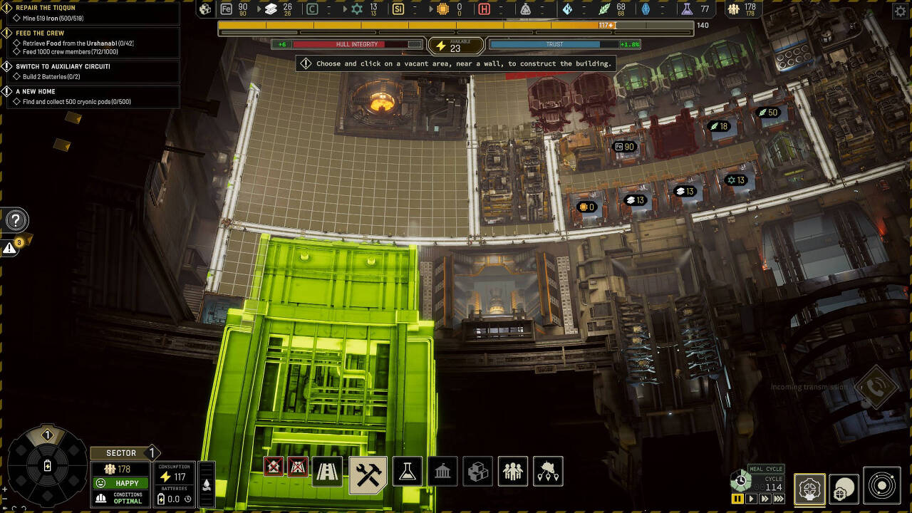Tiqqun 내부 보기(F1) 로 돌아갑니다 . 몇 가지 요청이 더 있음을 알 수 있습니다. Crew Quarters에서 한 번의 요청으로 영구적인 -1 안정성 페널티를 받습니다. 다른 요청은 Docking Bay에 있으며 500개의 Cryonic 포드를 찾아 수집해야 합니다. 이것이 우리의 다음 주요 목표가 될 것입니다. 배터리 2개 - 계층 1을 빌드한 직후입니다. 아래 표시된 각 모서리에 배터리를 빌드하고 확장합니다. 그들을 만지는 길.