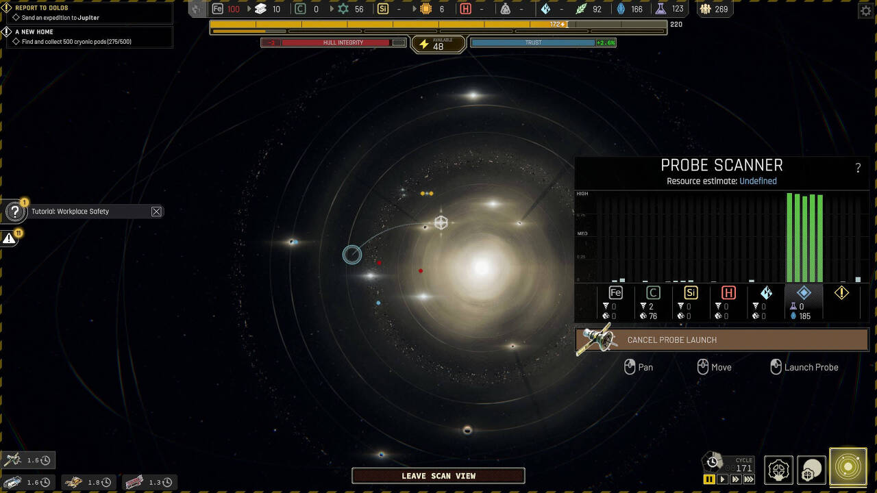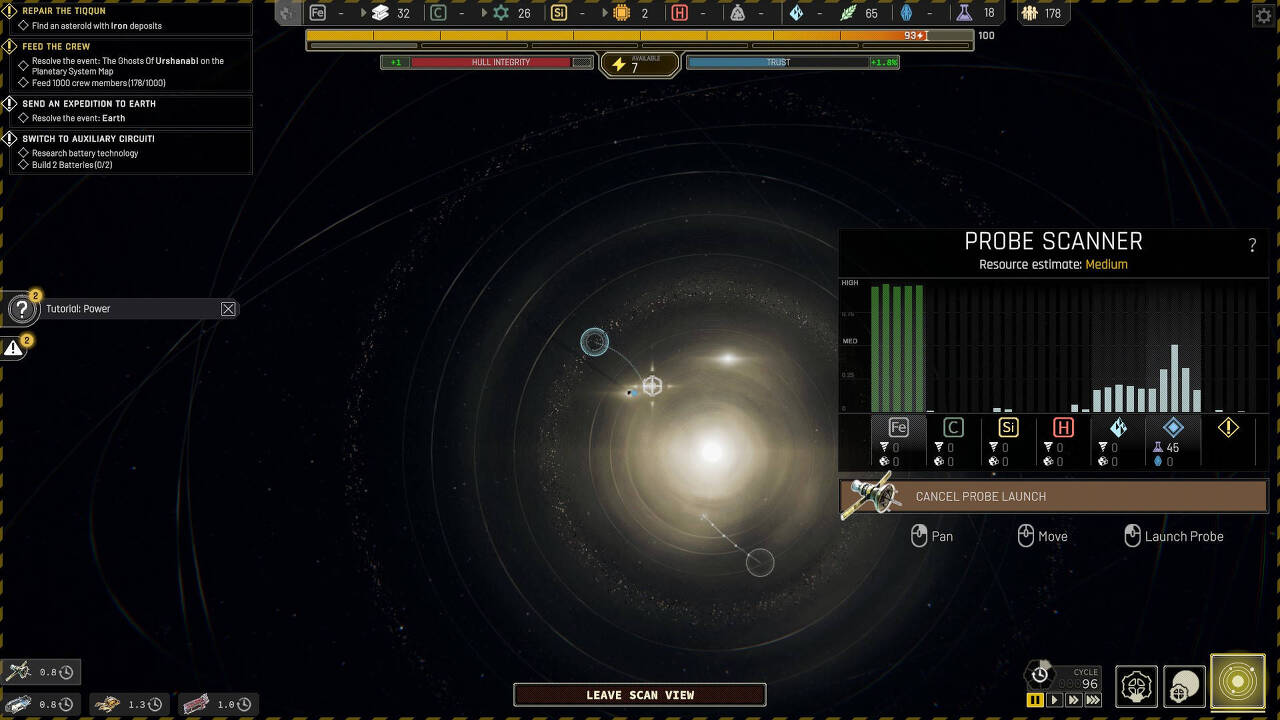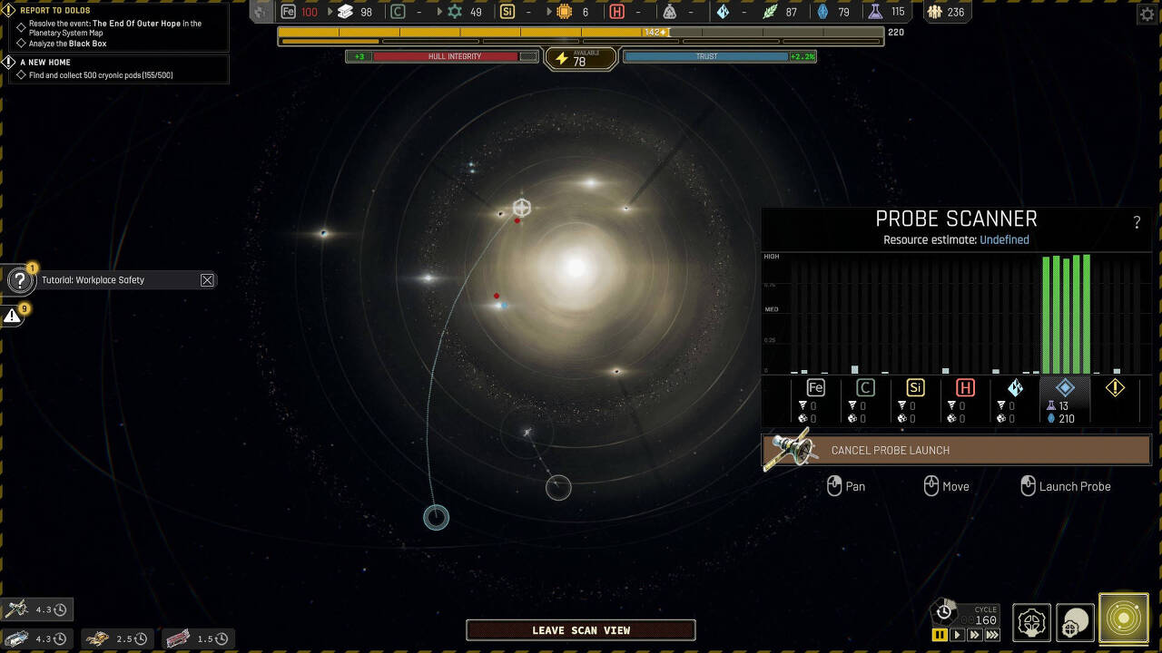 우리는 약간의 가동 중지 시간이 있으며 Alloy가 부족할 위험이 있으므로 Probe를 보내 더 많은 철 소행성을 찾으십시오. 돌아다닐 것이 많습니다!