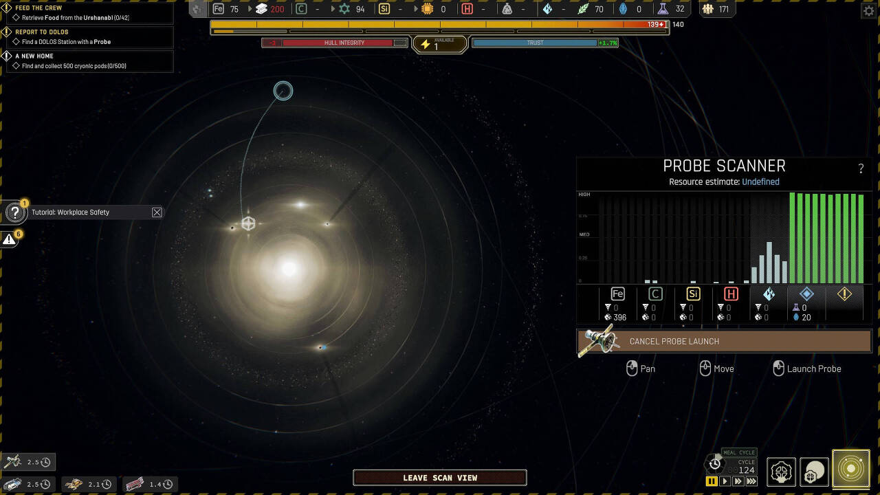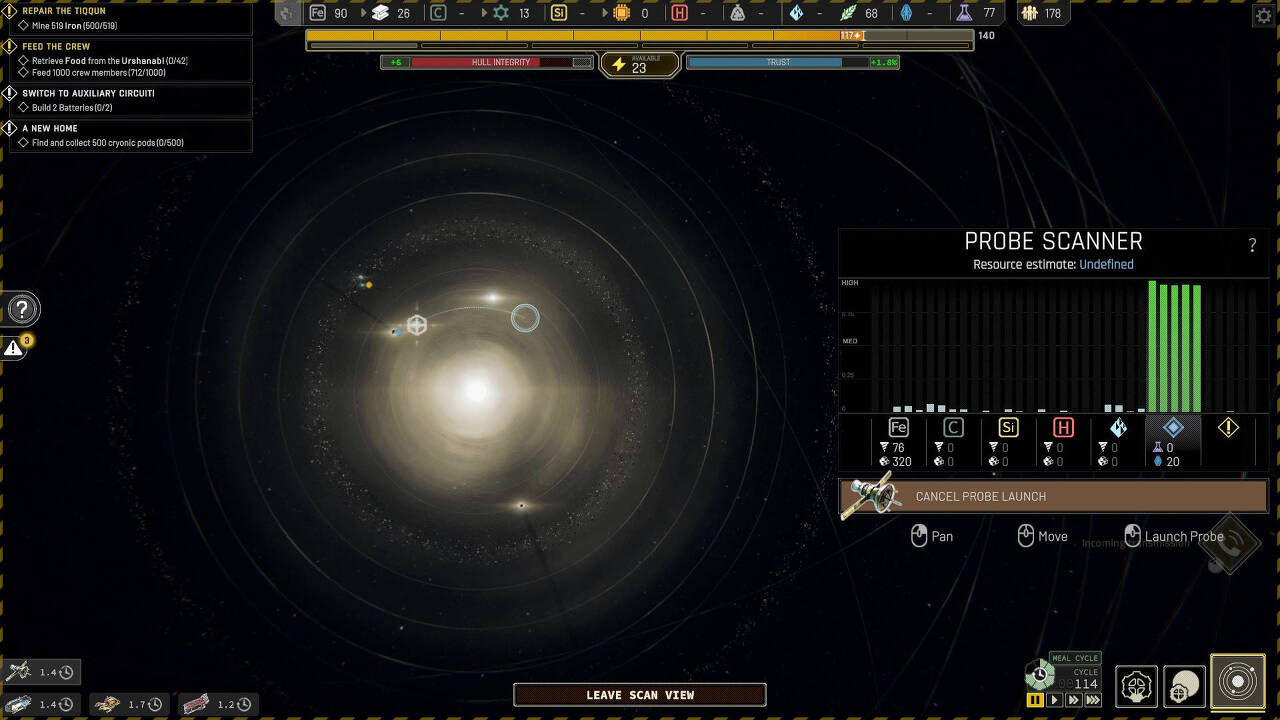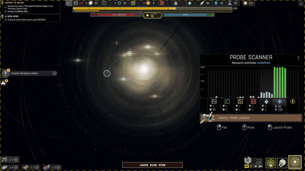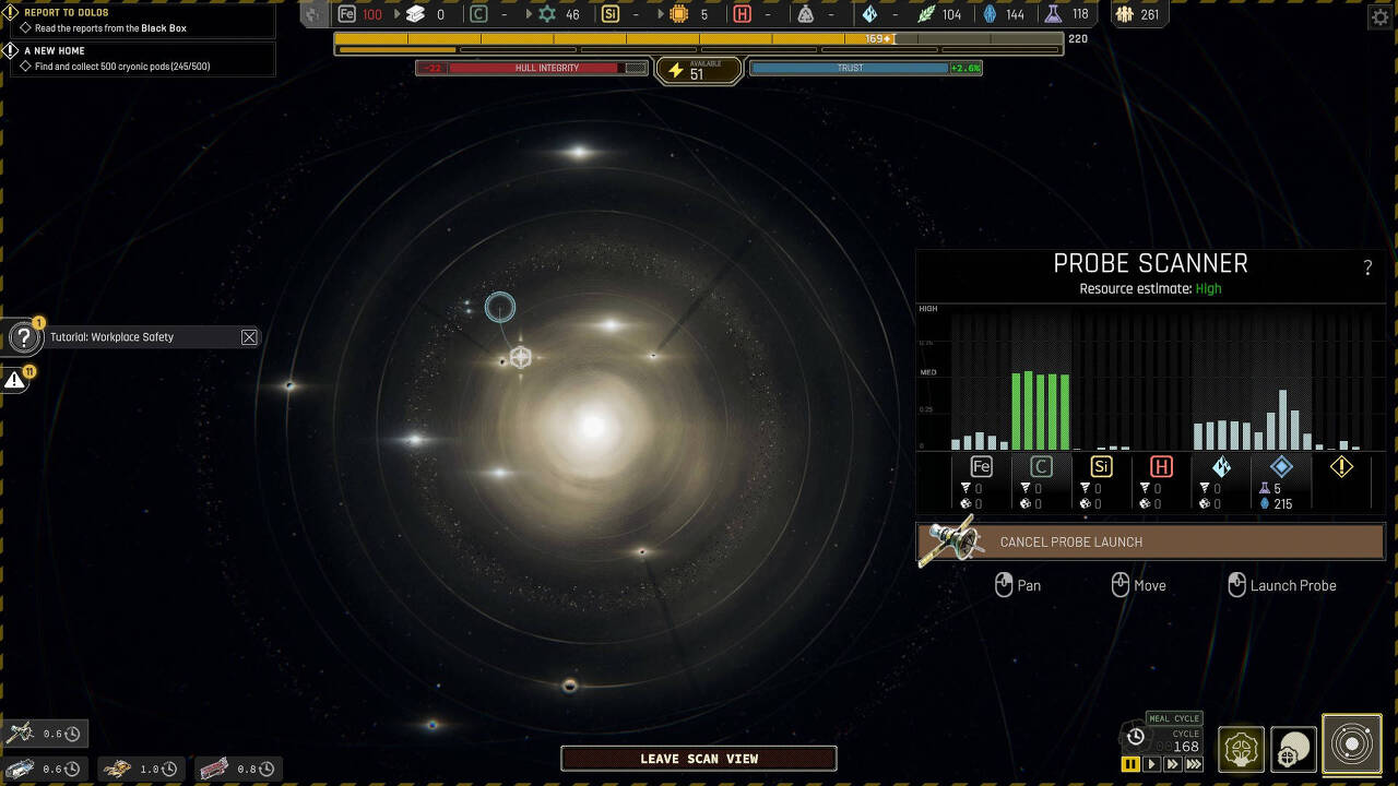 우리는 약간의 가동 중지 시간이 있으며 Alloy가 부족할 위험이 있으므로 Probe를 보내 더 많은 철 소행성을 찾으십시오. 돌아다닐 것이 많습니다!