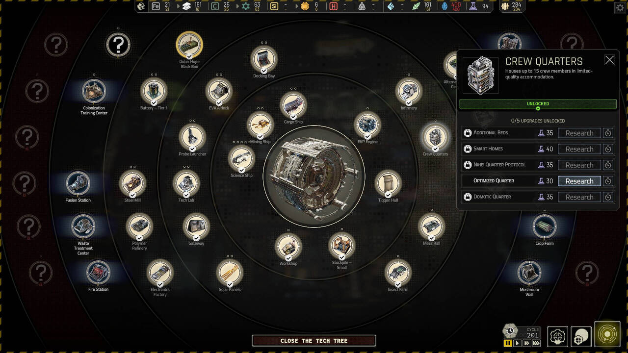 이것이 진행되는 동안 인구 문제를 해결해야 합니다. Tech Lab을 열고 Crew Quarters를 클릭한 다음 "Optimized Quarter" 조사를 시작하십시오. 이렇게 하면 2개의 승무원 숙소 공간에 10명의 승무원을 추가로 저장할 수 있는 새 건물이 잠금 해제됩니다.