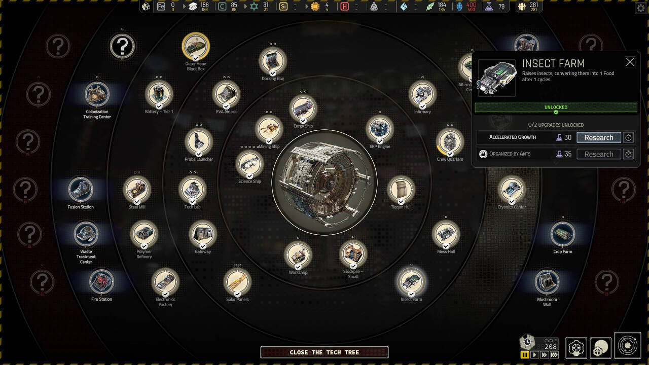 당신은 또한 식량 생산을 주시해야 합니다. 6개의 곤충 농장은 335명의 인구를 위한 충분한 식량을 생산하므로 모든 사람을 지원할 만큼 충분하지 않을 수 있습니다. 만일을 대비하여 다음 챕터를 위해 약간의 연구를 예약하고 싶으므로 모든 것이 균형을 이루도록 노력하십시오.