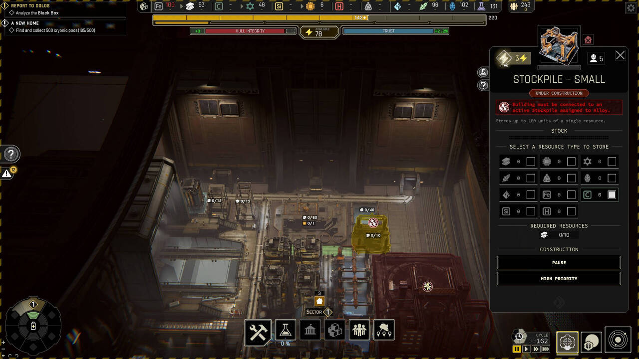 이 모든 Cryonic Pod가 들어오면 어딘가에 저장하고 열어야 합니다. Cryonics Center와 추가 비축물을 건설하십시오 - 소형. Stockpile을 Cryonic Pods로 설정합니다.