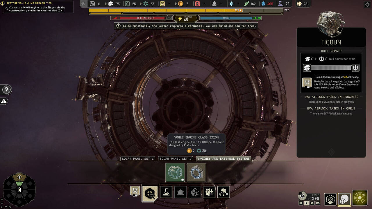 다음 이동은 Tiqqun Exterior View(F2)로 이동하는 것입니다. Exterior Building 왼쪽에 있는 버튼을 눌러 Hull Repair를 켭니다. 그런 다음 Exterior Building을 클릭하고 Solar Panel Set 2를 클릭한 다음 Small Solar Panel 1을 만드십시오. 이렇게 하면 선체 수리가 일시 중지되지만 건설이 완료되면 자동으로 다시 활성화됩니다.
