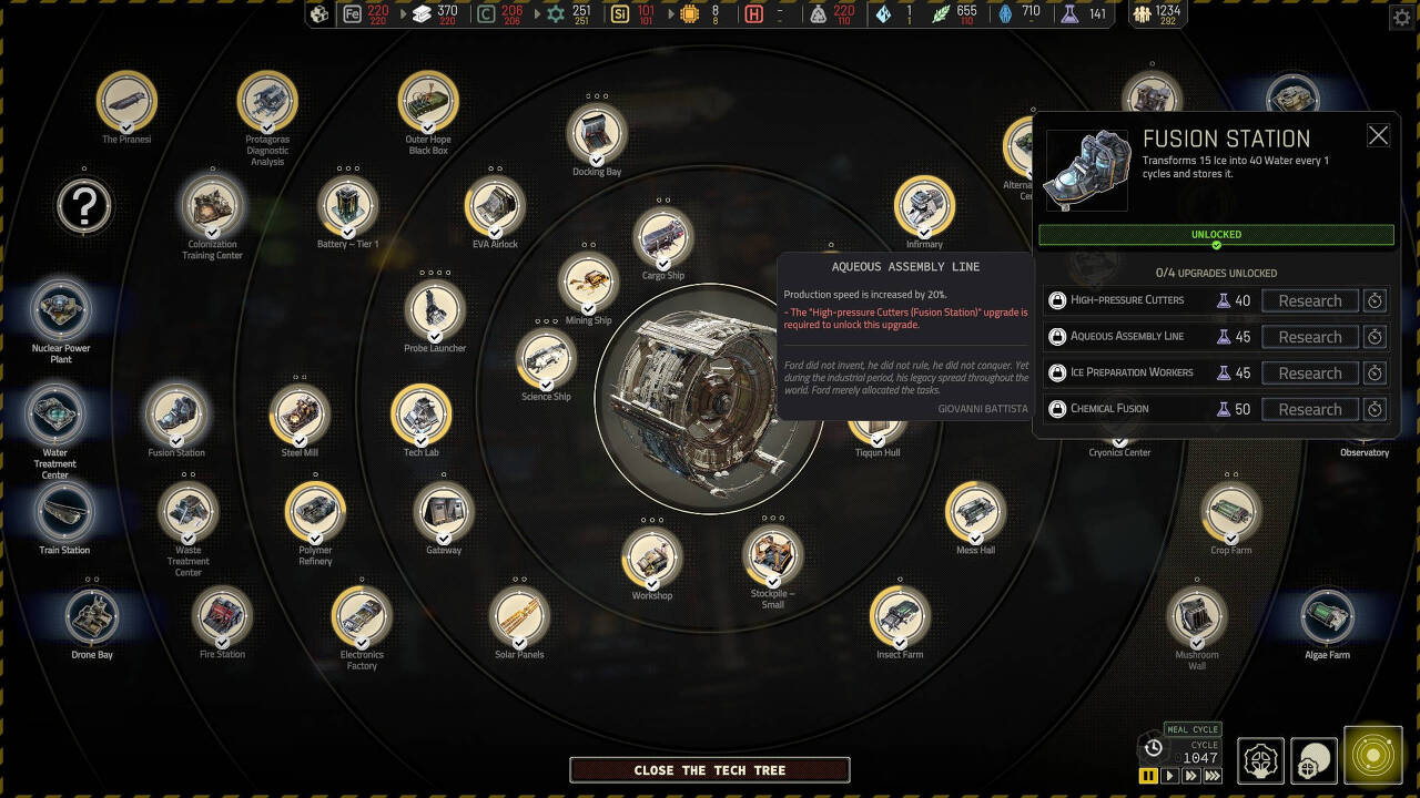 테크 트리의 거의 모든 아이콘에는 기본 아이템을 향상시키는 "하위 기술"이 있습니다. 예를 들어 도킹 베이는 자원의 적재 및 하역 속도를 10% 증가시키는 "스탠포드의 부품" 기술로 개선할 수 있습니다.